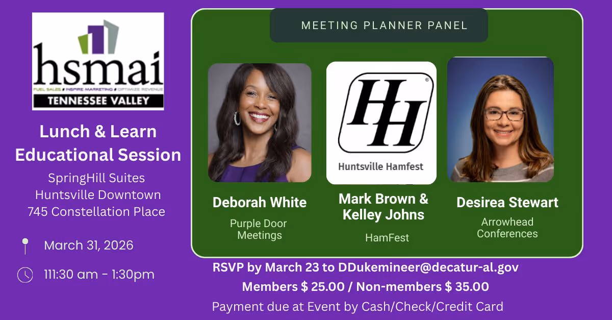 🌟 Hospitality Professionals — You’re Invited! 🌟Join the HSMAI Tennessee Valley Chapter for an engaging Lunch & Learn designed for hospitality sales leaders, marketing professionals, revenue managers, and digital marketers across the region.📅 March 31, 2026📍 Huntsville, AlabamaThis month’s program features a Meeting Planners Panel, where industry experts will share insights on what planners are looking for today, emerging trends in meetings and events, and how hospitality teams can better position their hotels and venues to win more business.This is a great education and networking opportunity to connect with fellow hospitality professionals from across the Tennessee Valley while gaining valuable insights you can take back to your team.✨ Why attend?• Learn directly from experienced meeting planners• Stay current on meetings & events trends• Network with regional hospitality professionals• Gain practical strategies to grow your businessWhether you work in sales, marketing, revenue management, or digital strategy, this session will offer valuable perspectives to help you succeed in today’s competitive hospitality landscape.👉 Plan to join us in Huntsville and be part of the conversation!